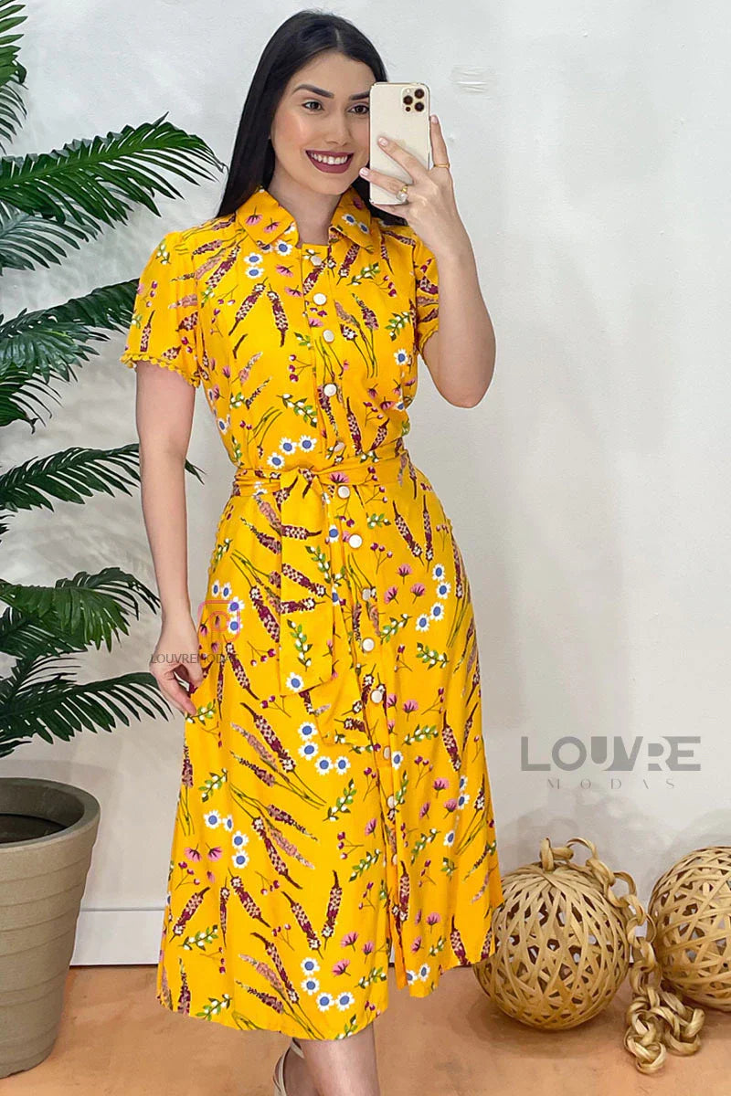 Vestido amarelo estampado com Botões funcionais, bolsos e detalhes em Guipir