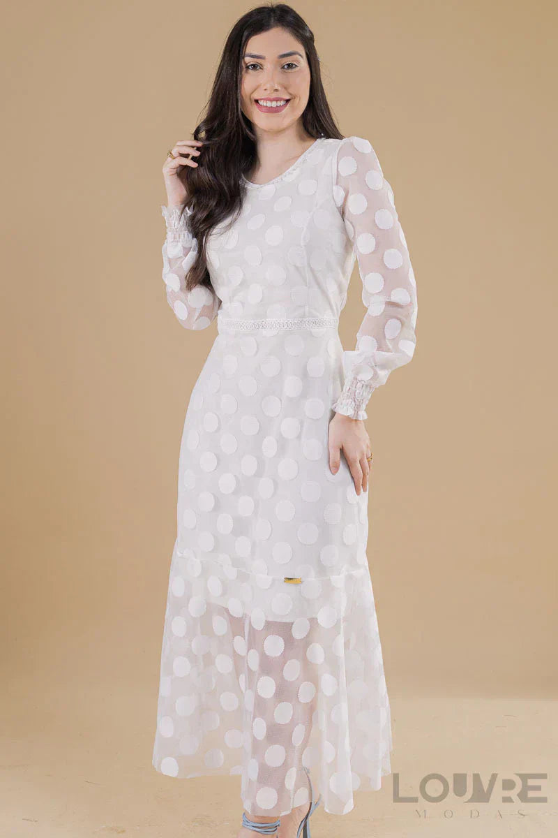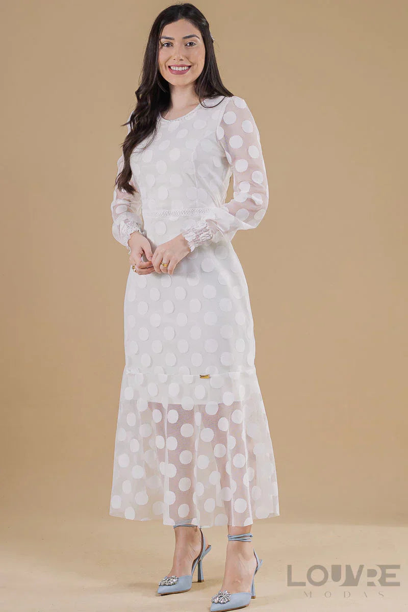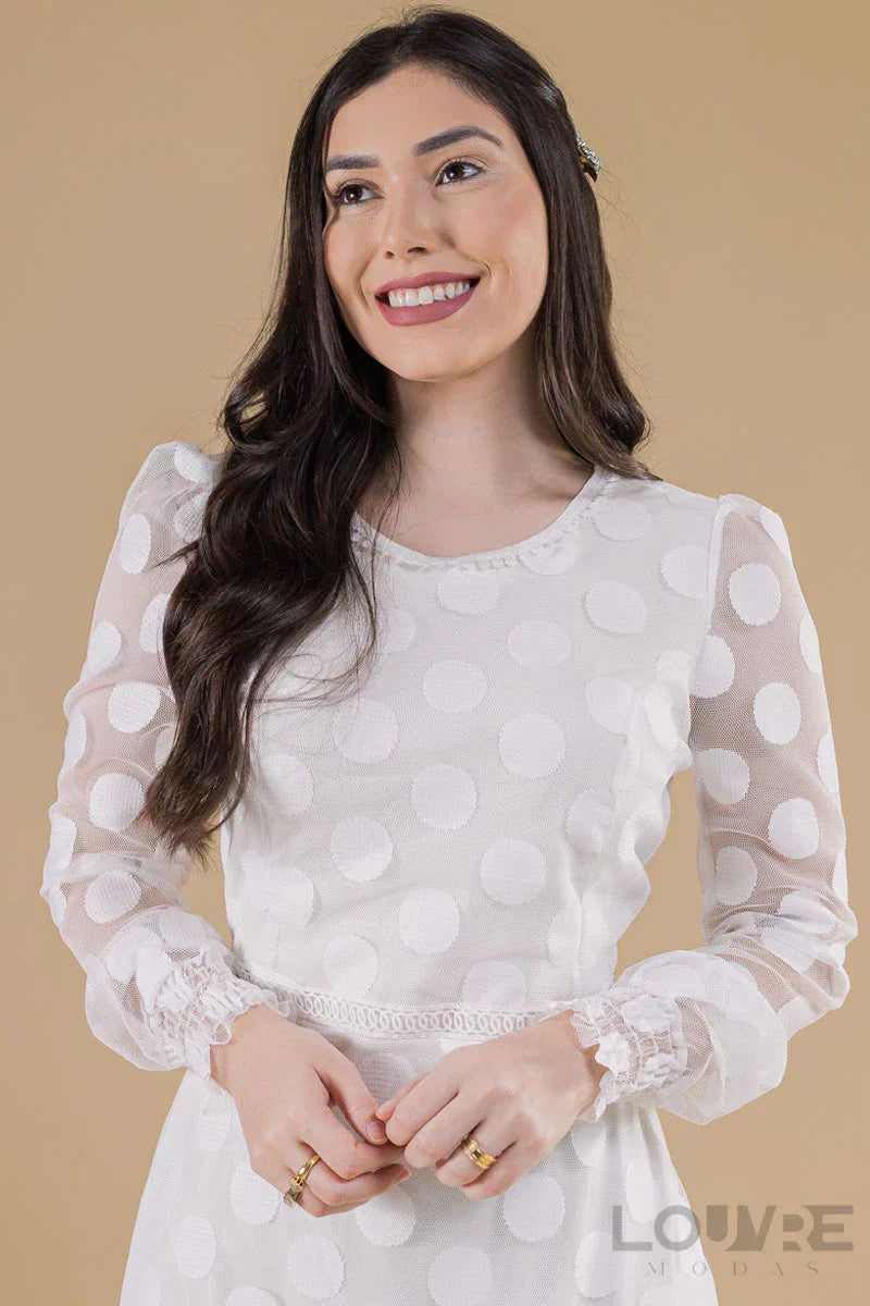 Vestido Branco em Tule detalhes na cintura e gola
