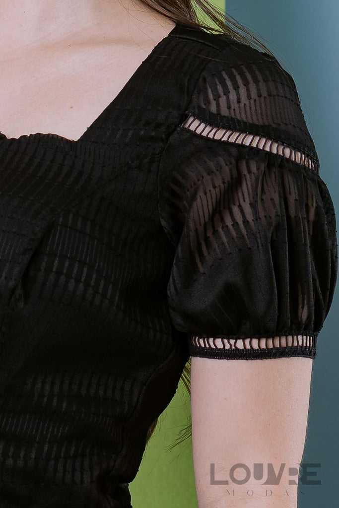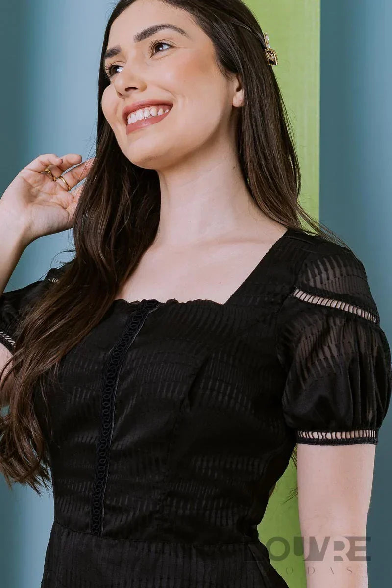Vestido em Chiffon Três Marias Preto com detalhes em entremeios na manga e saias
