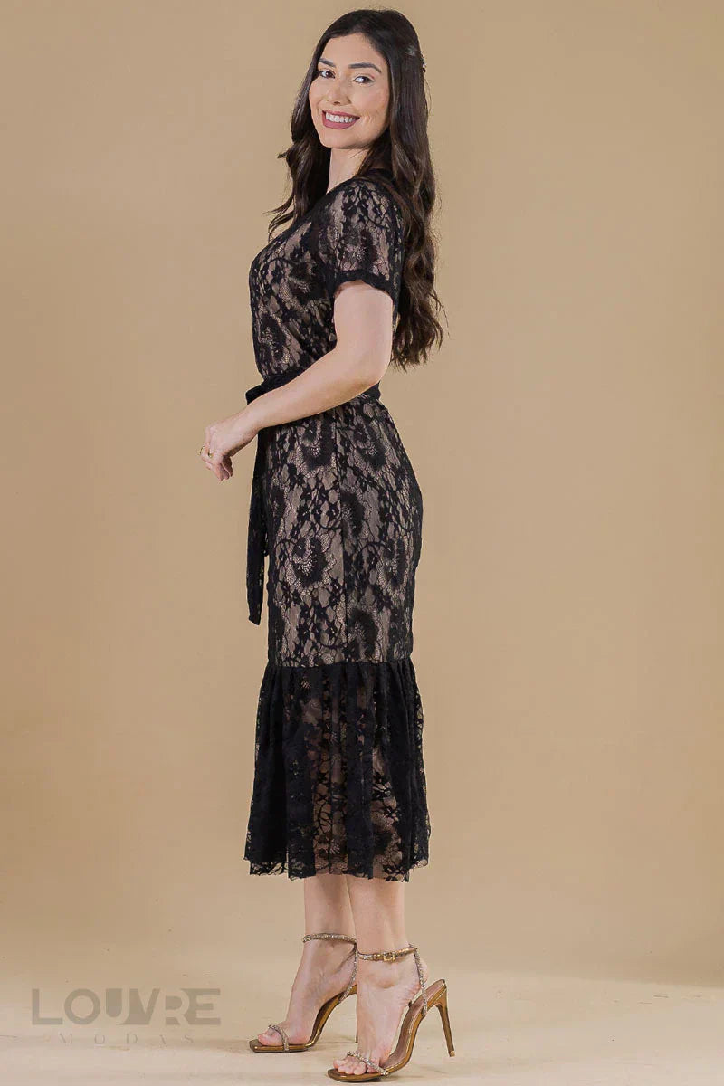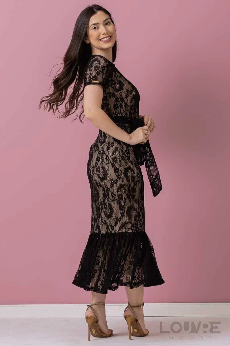 Vestido em Renda preto forrado Midi