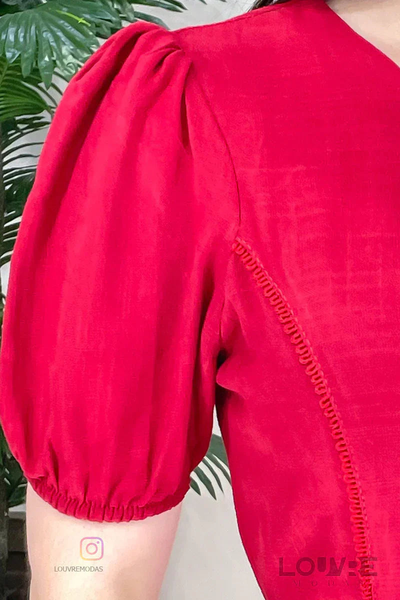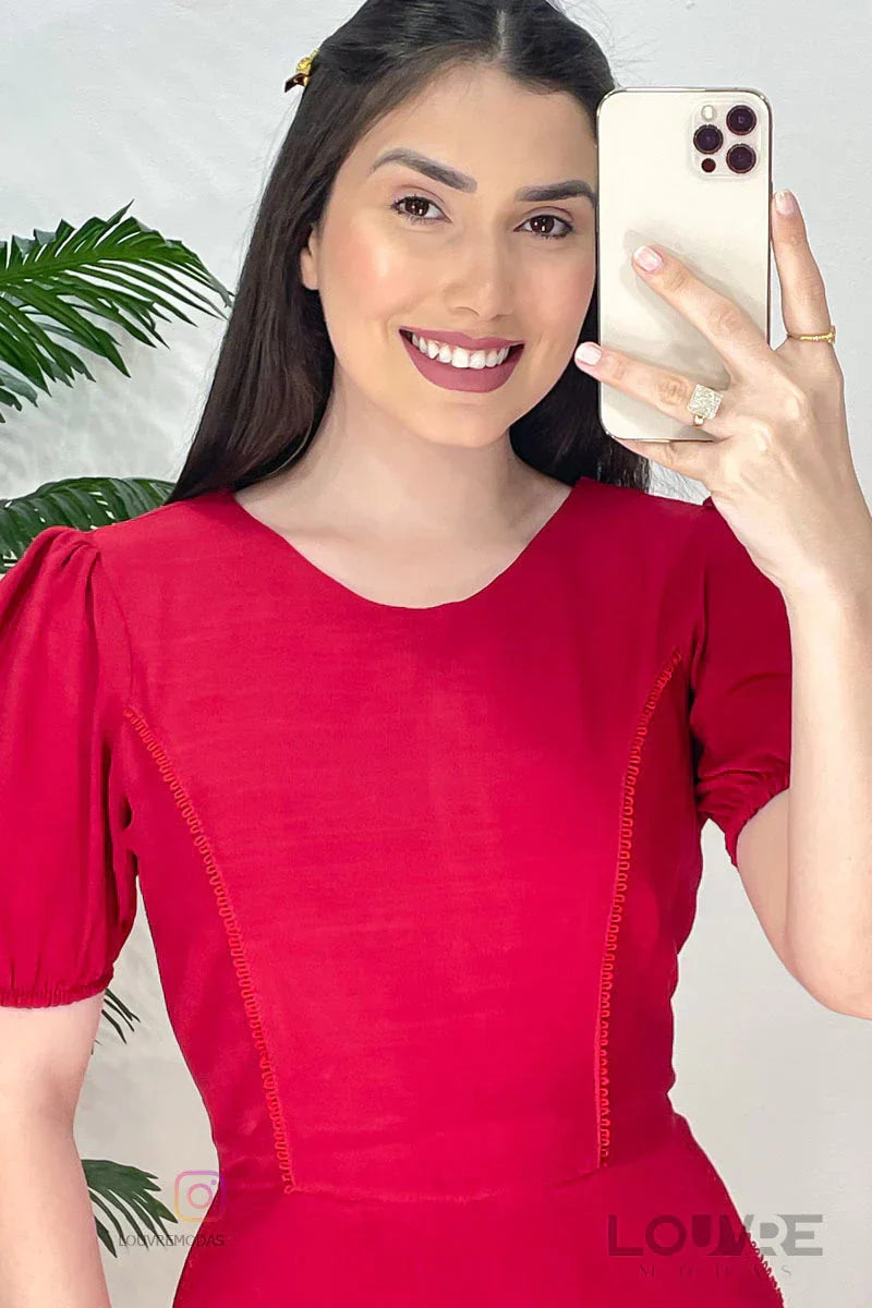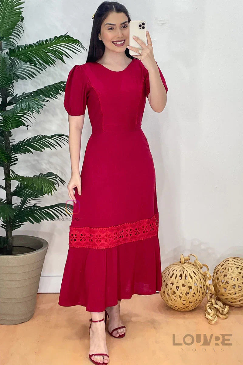 Vestido em Viscolinho forrado com detalhes em Guipir na Saia