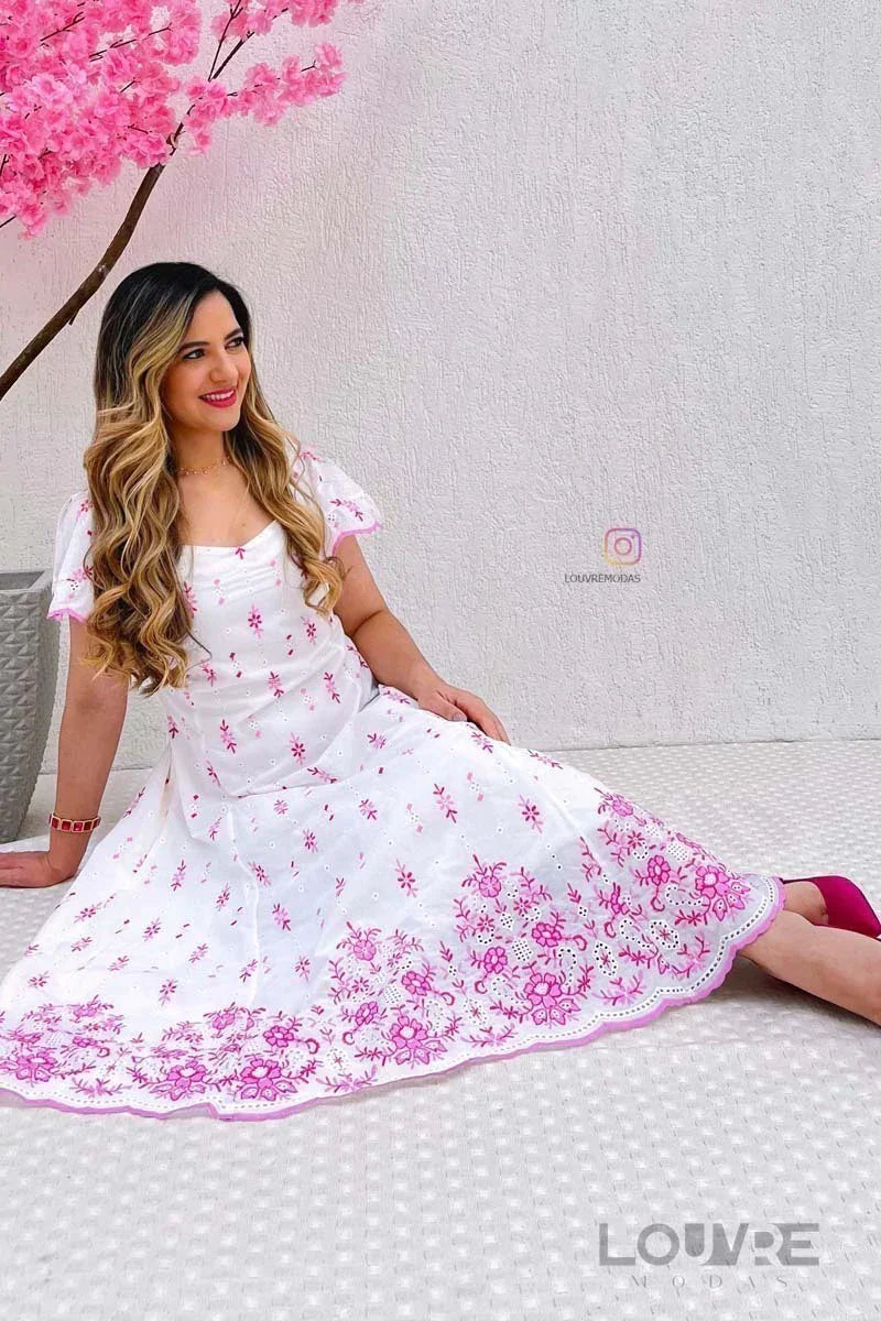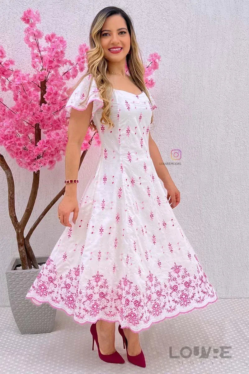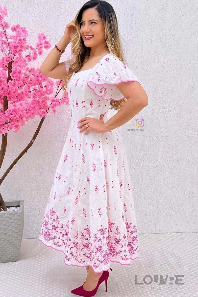 Vestido Midi em Laise de Algodão com Bordados Rosas - Lançamento Moda Evangélica e Executiva