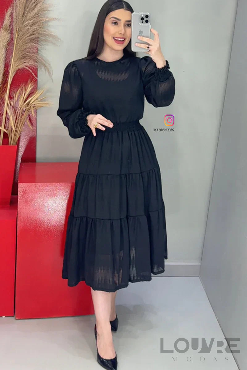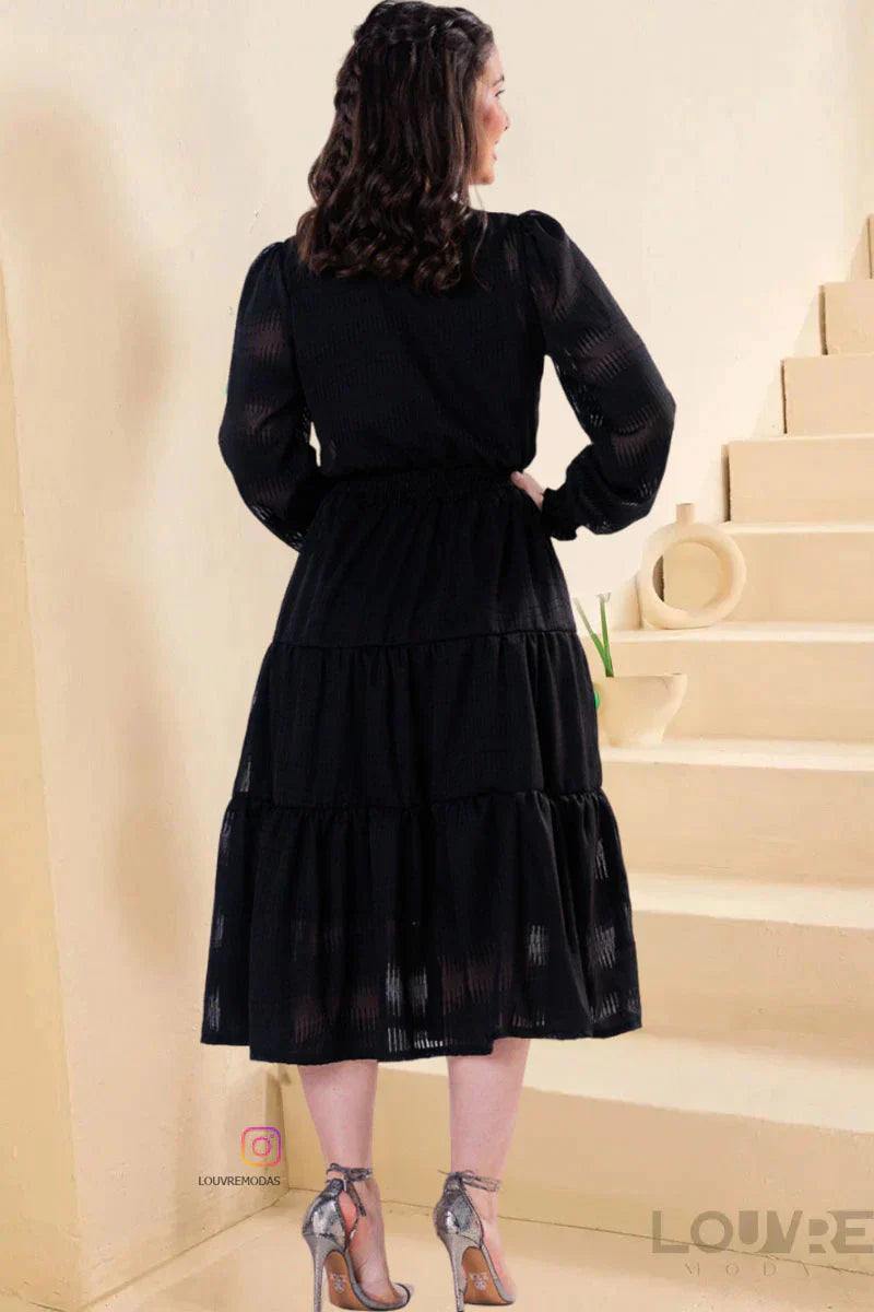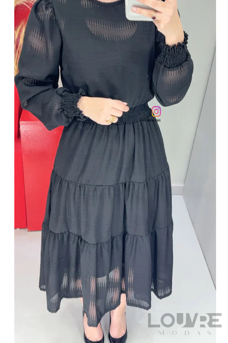 Vestido Preto com Tecido trabalhado Detalhes em Guipir na gola